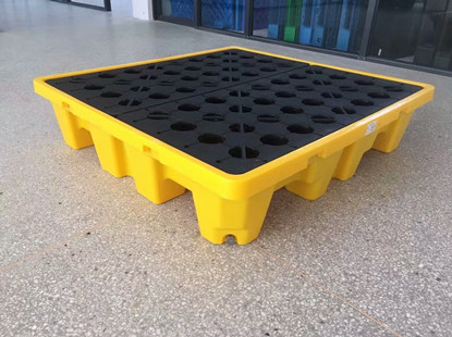 四桶防漏托盤規(guī)格:1300*1300*300/mm;自重36kg;載重3000kg;盛漏量260升;適用機動叉車及手動液壓車;